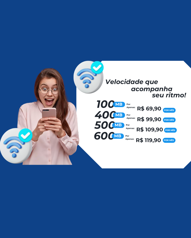 A internet 100% Mundo Digital leva alta velocidade e estabilidade de sinal pra você aproveitar a melhor experiência de conexão. Levamos a fibra dentro da sua casa, e não apenas até o poste. Por isso, a nossa internet fibra é mais rápida e com menos oscilação de sinal. Publique fotos e vídeos muito mais rápido nas redes sociais, assista a vídeos, filmes e séries com conexão estável, jogue online sem lag e trabalhe em home office à vontade. Assine nossos planos e aproveite.